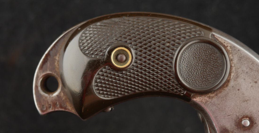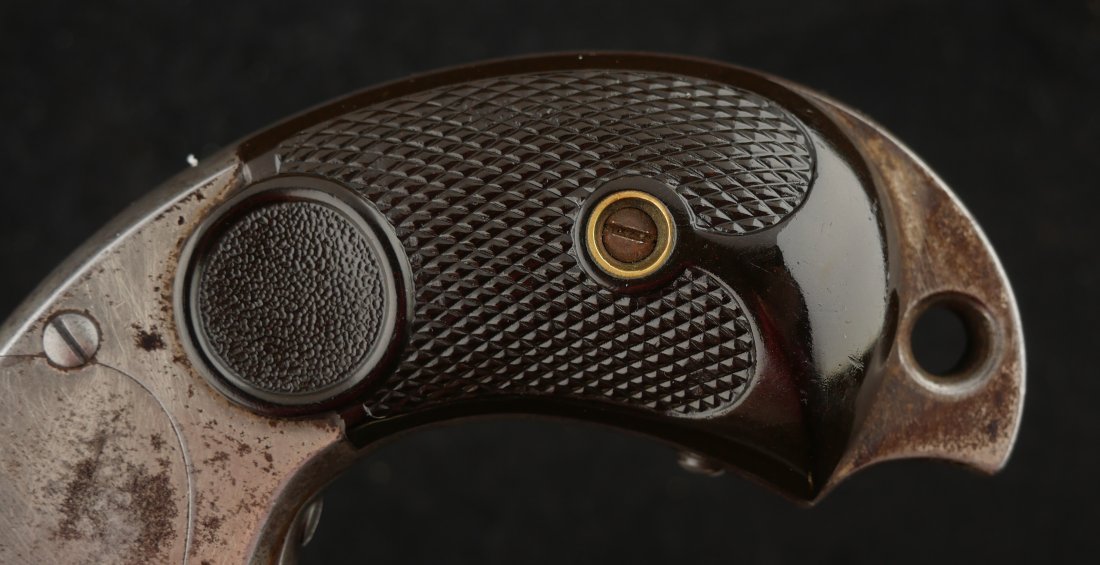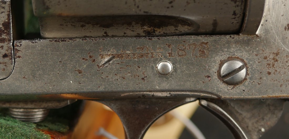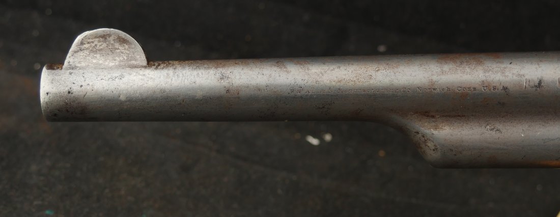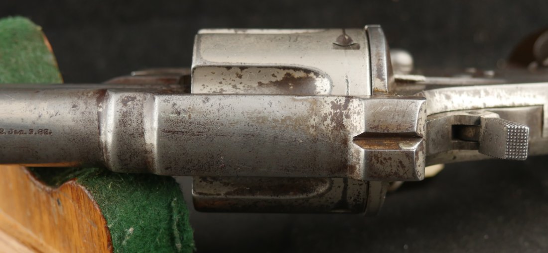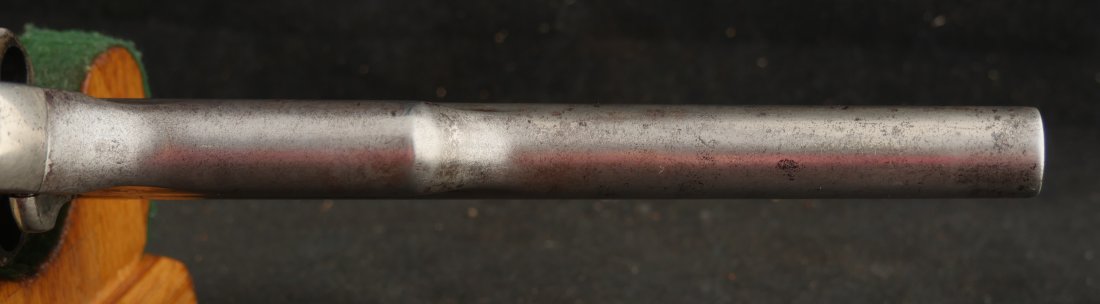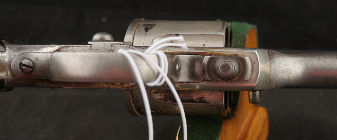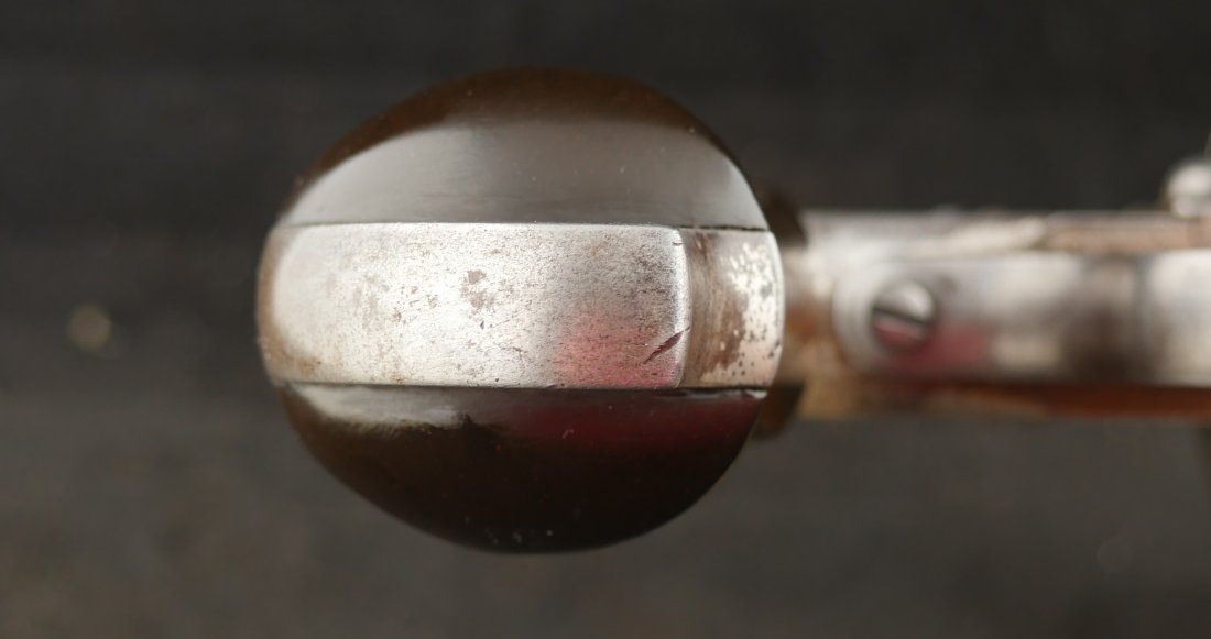 GR-1125-6725, Merwin & Hulbert Large Frame Double Action Revolver. 44-40 cal. 7 inch barrel. 6 shot. Ribbed barrel and bird’s head butt. Serial number 89XX matches on the frame, barrel and cylinder. The gun retains about 30% original nickel finish. Fine condition, original checker hard rubber grips. The gun shows evidence of honest use and years of carry wear. The mechanics are crisp and tight in both DA and SA. The bore is bright, shiny, and crisply rifled with a few fine scattered spots. Very good + bore. Suction in the action is good. This is a nice old used Cowboy gun. Very good overall.