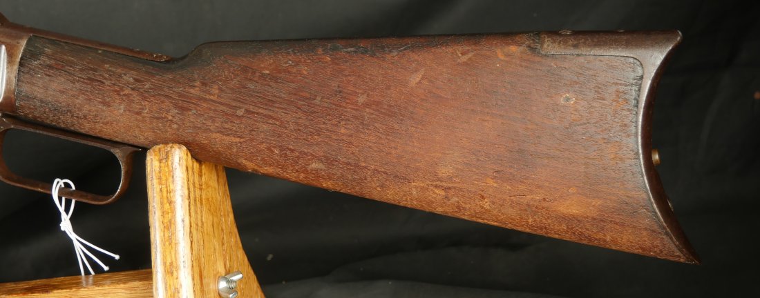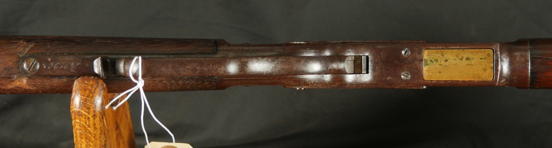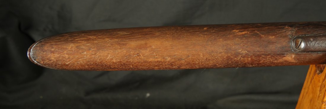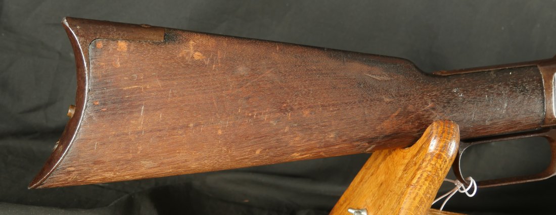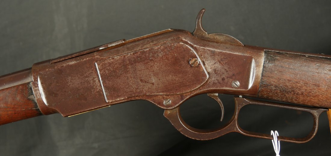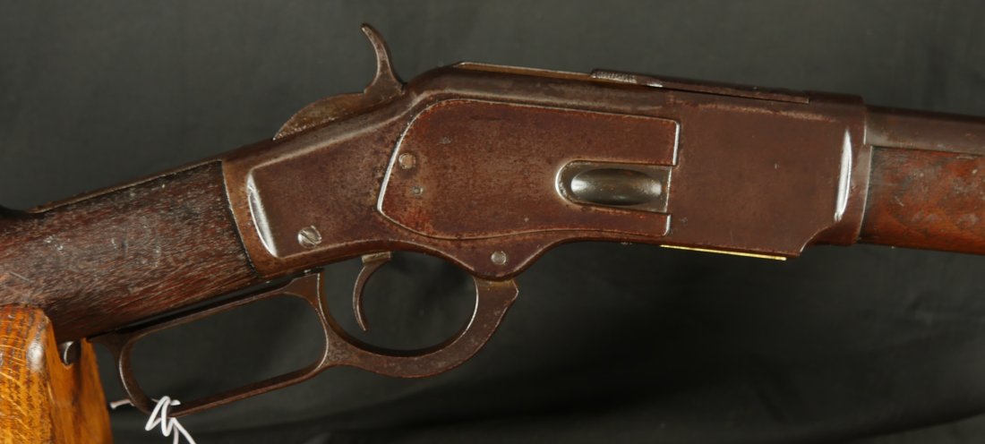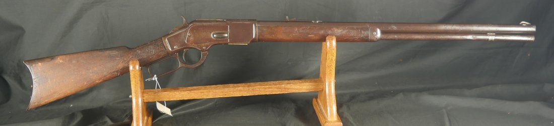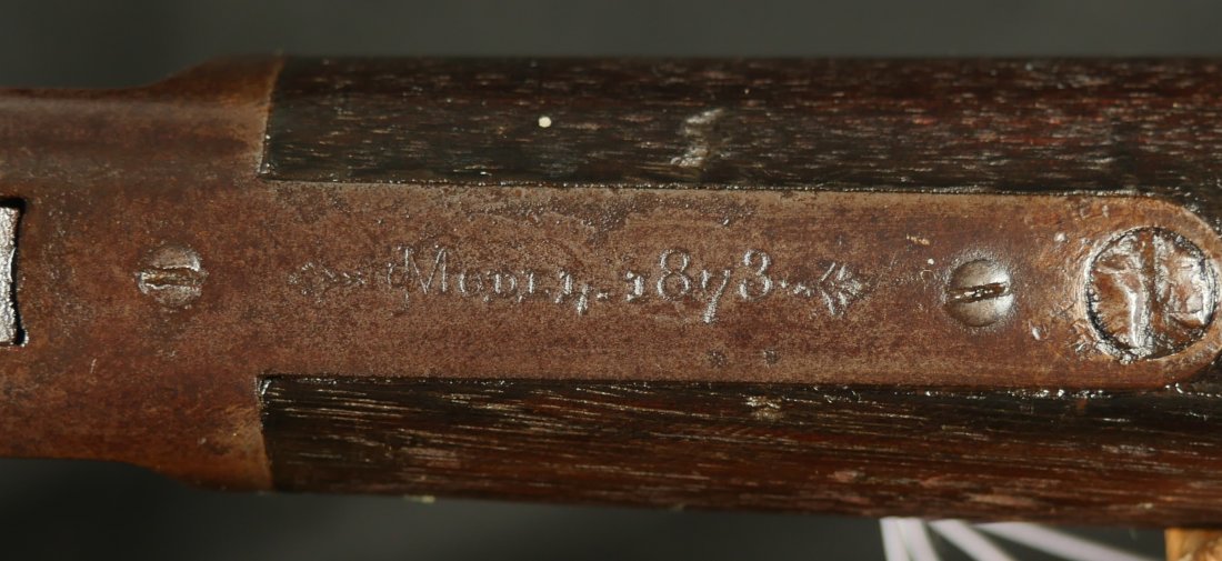 GR-1125-6730, Winchester Model 1873 Round Barrel Rifle. 44-40 Cal. Serial number 142,XXX, made in 1883. 24 Inch barrel. The gun is covered in a dark brown patina with patches of surface residue. There is a replaced screw on the left side plate, it has been there a very long time. There is a large dent in the magazine tube, it is on the bottom side of the tube about 6 inches from the muzzle. The stocks show considerable bumps, dings, a crack in the bottom of the forearm. The wood shows evidence of years of heavy use and carry wear. The bore is bright, rifling is crisp and there are scattered spots and residue the length of the bore. Very good bore. Should clean a little better. The mechanics are functional. Very good overall.