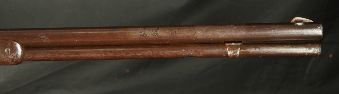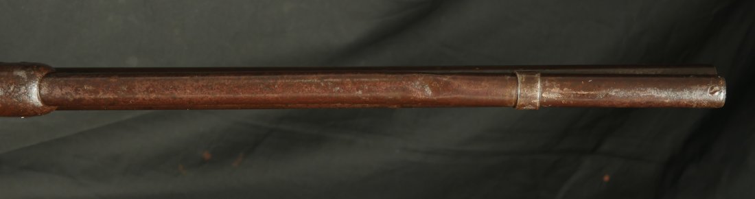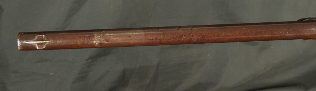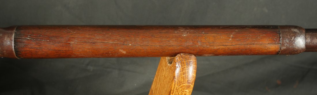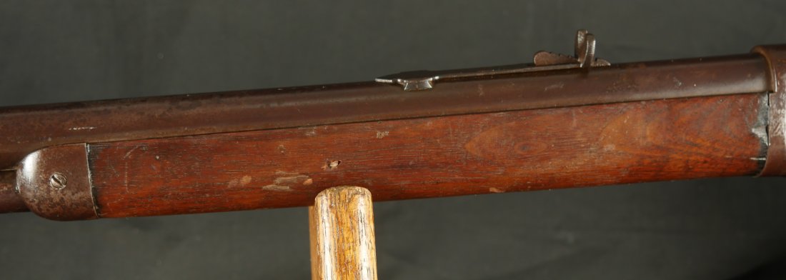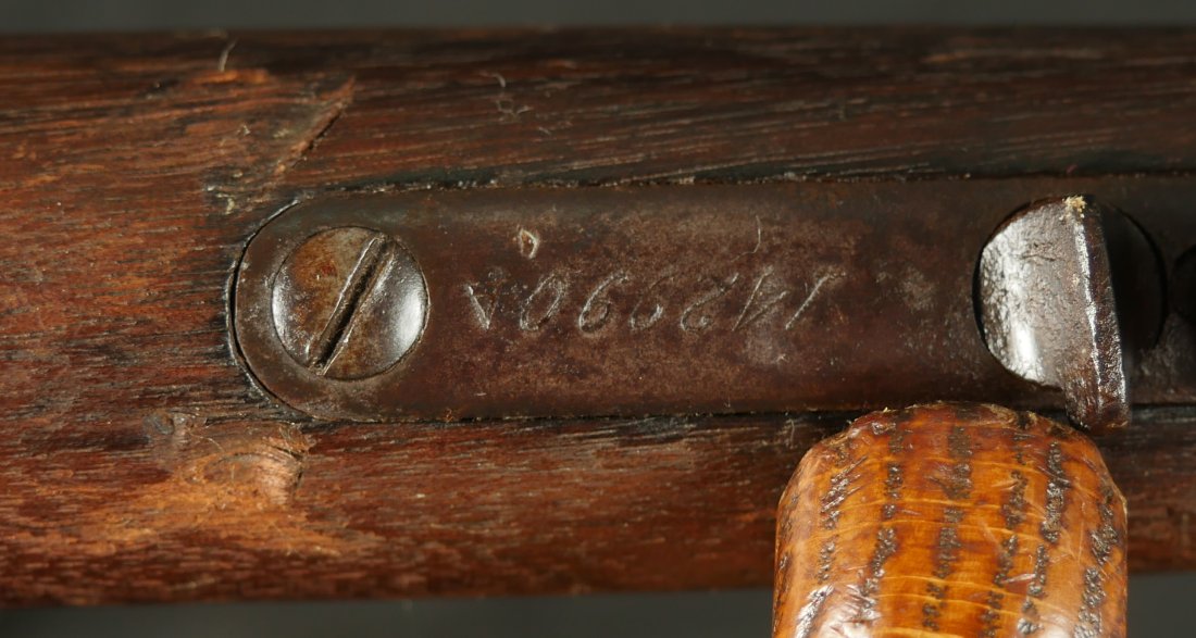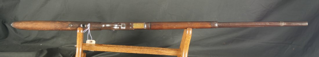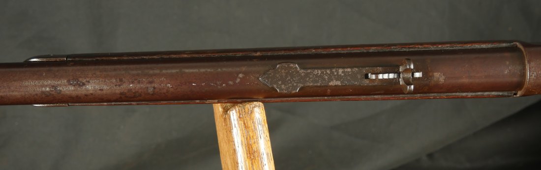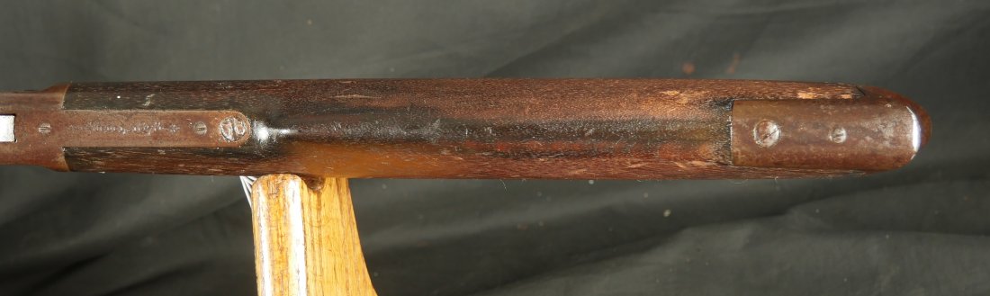 GR-1125-6730, Winchester Model 1873 Round Barrel Rifle. 44-40 Cal. Serial number 142,XXX, made in 1883. 24 Inch barrel. The gun is covered in a dark brown patina with patches of surface residue. There is a replaced screw on the left side plate, it has been there a very long time. There is a large dent in the magazine tube, it is on the bottom side of the tube about 6 inches from the muzzle. The stocks show considerable bumps, dings, a crack in the bottom of the forearm. The wood shows evidence of years of heavy use and carry wear. The bore is bright, rifling is crisp and there are scattered spots and residue the length of the bore. Very good bore. Should clean a little better. The mechanics are functional. Very good overall.