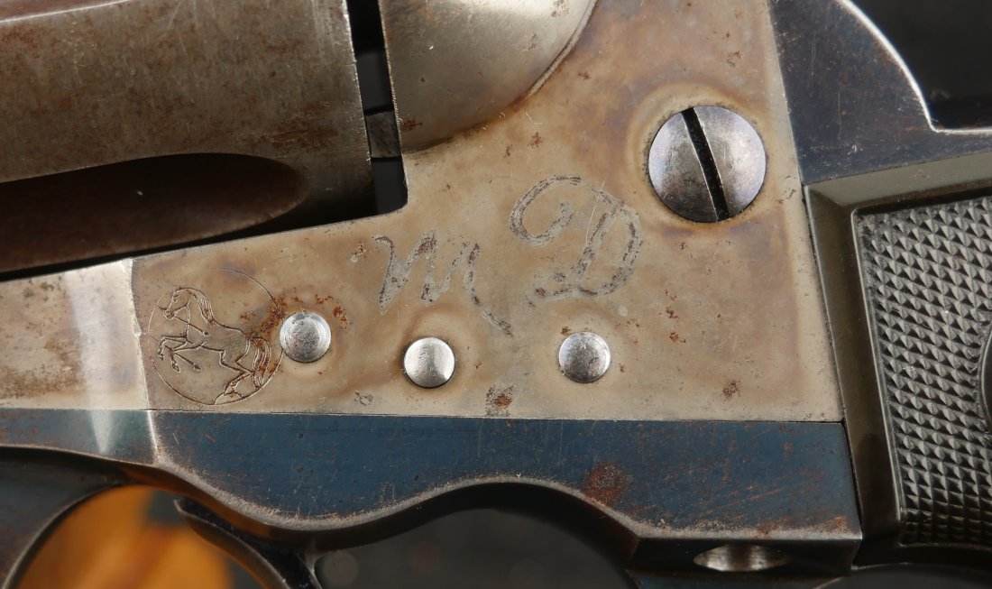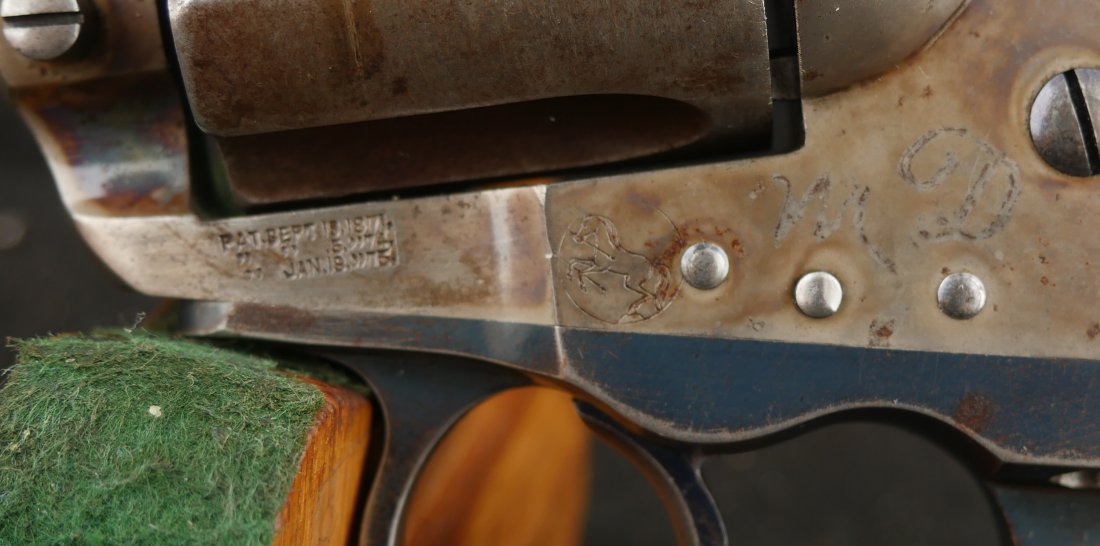 GR-1225-6735, Colt Model 1877 Lightning. .38. 6 Shot. the gun retains about 50% deep original blue on the barrel, ejector housing, back-strap and trigger-guard. The cylinder only has flashes of original blue. The grips are hard rubber and in excellent condition with crisp checkering. Grip to metal fit is excellent. The frame shows about 40% bright original case color. The bore is bright, shiny and crisply rifled. Excellent bore. The mechanics are crisp and tight in both DA and SA. Serial number 106,xxx matches on the frame, guard, strap and back of the cylinder. Gun was made in 1897. The screw heads are all very nice with lots of nitre blue still on the screws. This is a very handsome gun and untouched gun. Fine to excellent overall.