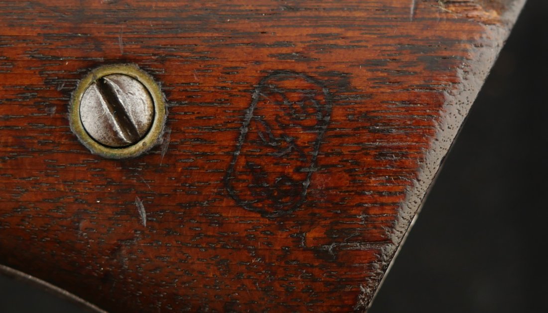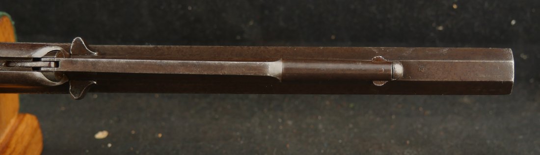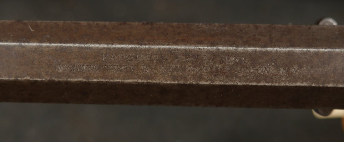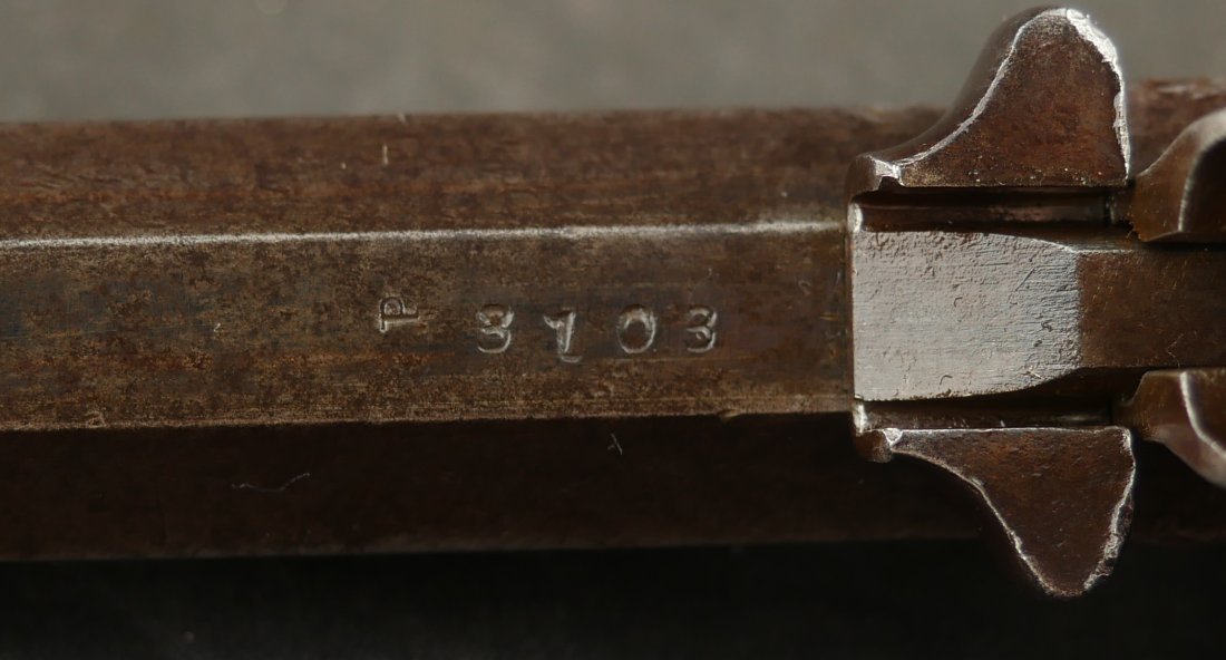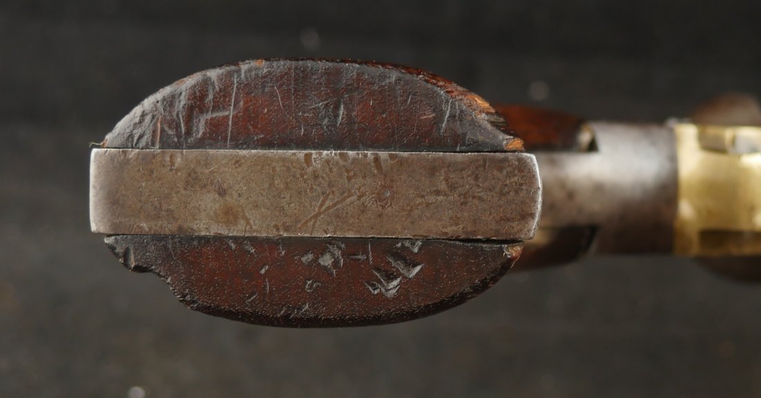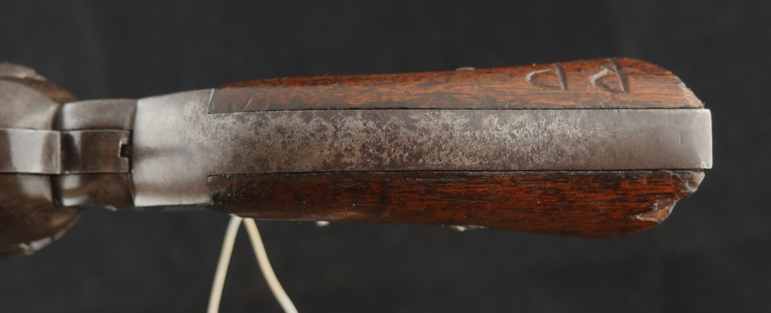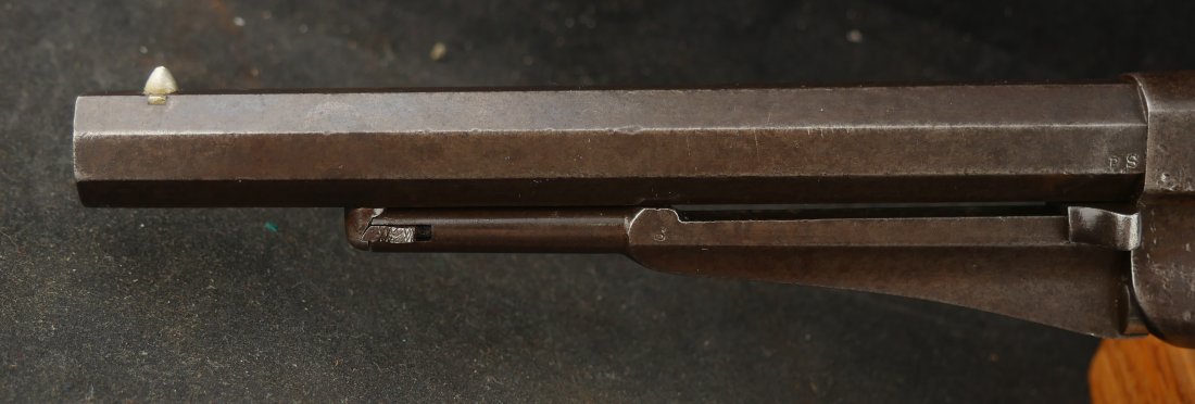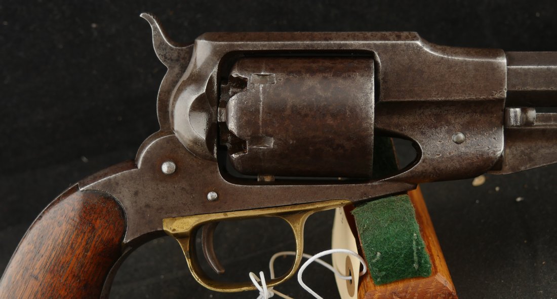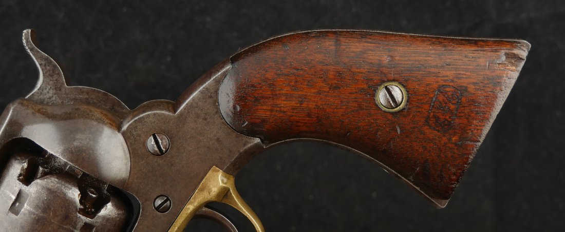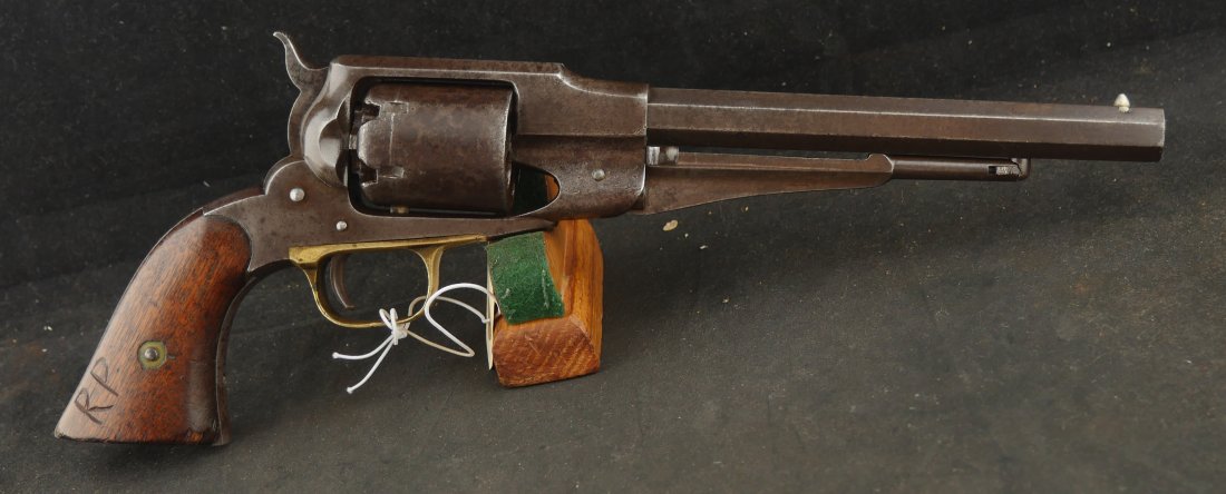 GR-1225-6739, Early Remington Old Model Army .44 with full complement of sub-inspector initials and visible cartouche on the left grip. Overall the gun is mottled dark brown with clear markings, crisp edges but only traces of original blue finish. The grips show moderate bottom edge wear with one moderate chip on the left grip that is very old. Deep initials are carved into right grip RP and a fine coating of oil has been applied to the grips to prevent them from drying out and cracking. The revolver retains the original slotted rammer. The serial number is 31xx and that number matches on the barrel, cylinder, trigger-guard and frame. This gun would be considered a first model Old Model or a transitional gun from the Beals army to the Old Model. The feature of the cylinder front face sitting flush against the straight frame is only found on the Beals or early Old models. The gun shows moderate overall bumps and dings, just evidence of years of honest use. This is a nice example of an early Old Model. All the numbers match, inspector marks are all present and legible. It could have been found in the 1870s just like it now after being heavily used in the Civil War and following years. The mechanics are crisp and tight. The half cock is functional and the cylinder locks up very tight in the full cock position. Very good overall and much better than average for an early Old Model Army, these guns were issued early in the war and were heavily used.