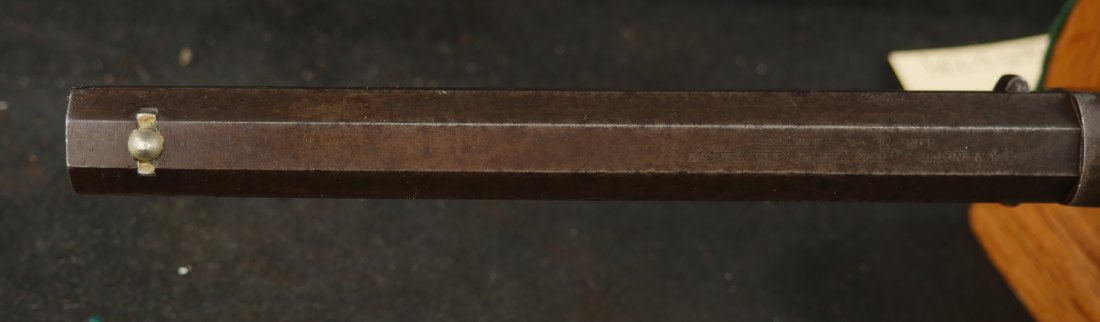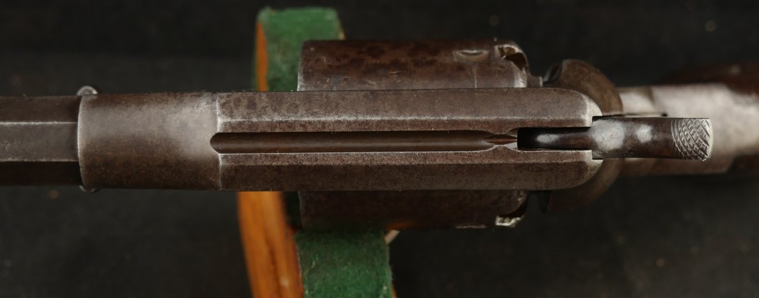 GR-1225-6739, Remington Old Model Army .44 with full complement of sub-inspector initials and visible cartouche on the left grip. Overall the gun is mottled dark brown with clear markings, crisp edges but only traces of original blue finish. The grips show moderate bottom edge wear with one moderate chip on the left grip that is very old. Deep initials are carved into right grip RP and a fine coating of oil has been applied to the grips to prevent them from drying out and cracking. The revolver retains the original slotted rammer. The serial number is 31xx and that number matches on the barrel, cylinder, trigger-guard and frame. This gun would be considered a first model Old Model or a transitional gun from the Beals army to the Old Model. The feature of the cylinder front face sitting flush against the straight frame is only found on the Beals or early Old models. The gun shows moderate overall bumps and dings, just evidence of years of honest use. This is a nice example of an early Old Model. All the numbers match, inspector marks are all present and legible. It could have been found in the 1870s just like it now after being heavily used in the Civil War and following years. The mechanics are crisp and tight. The half cock is functional and the cylinder locks up very tight in the full cock position. Very good overall and much better than average for an early Old Model Army, these guns were issued early in the war and were heavily used.