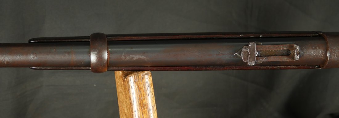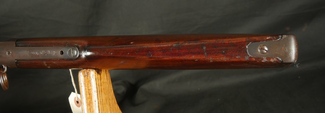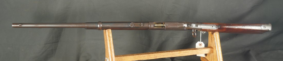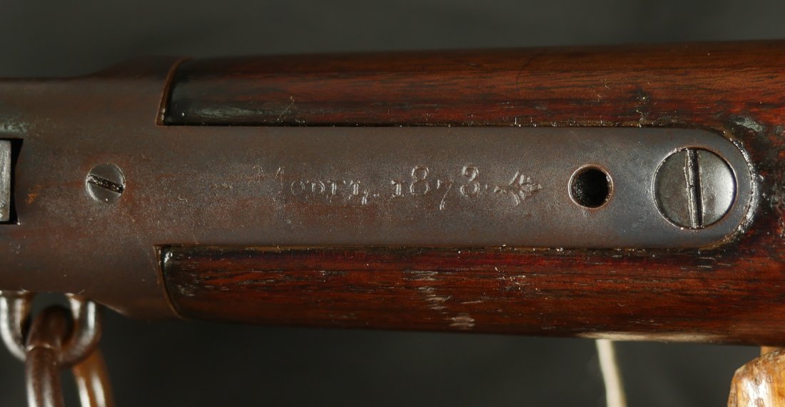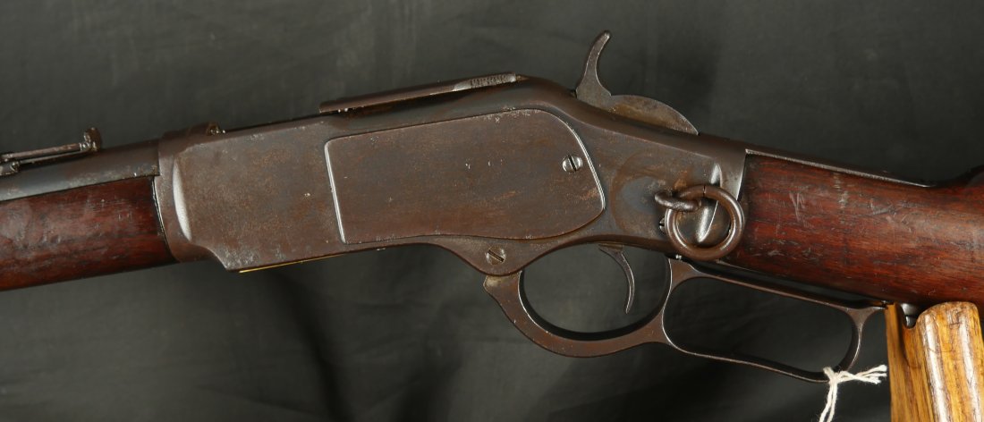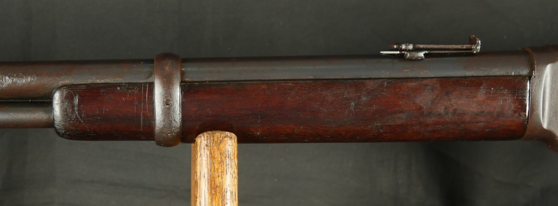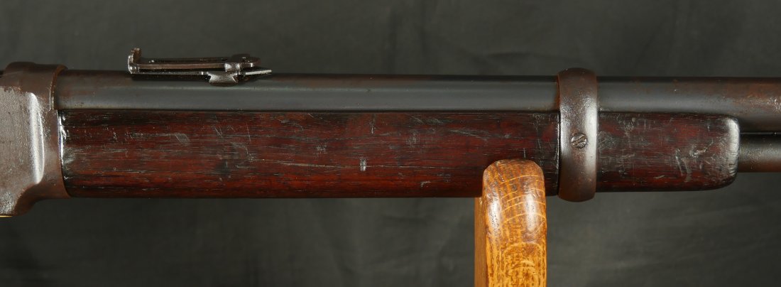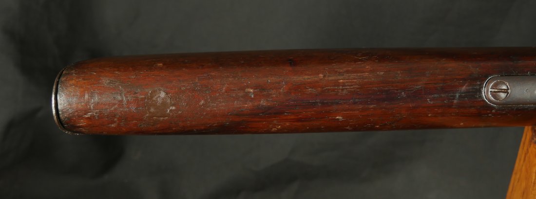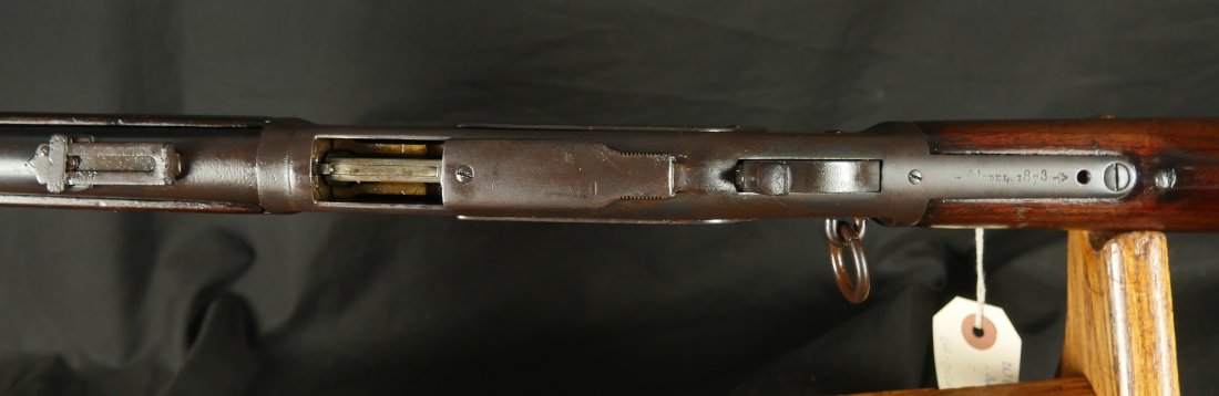 GR0126-6811, Winchester Model 1873 Saddle Ring Carbine. .32 cal. Serial number is restamped. The dust cover is stuck. The bore is bright, mostly shiny with strong rifling, a couple patches of pinprick like pits and some residue in the bore.