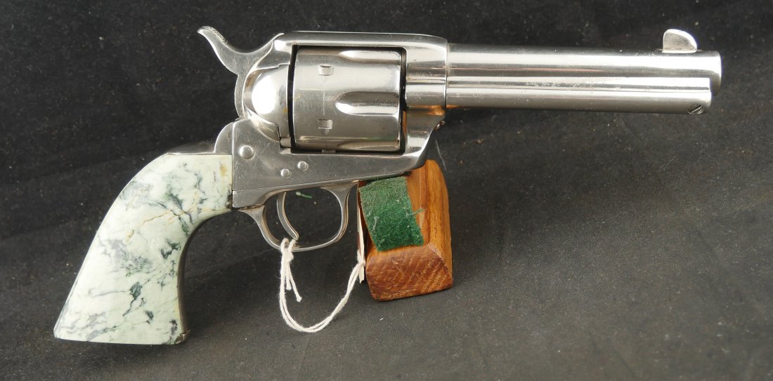 GR79-0522-4159, Colt Newline .41 CF. 2nd Model with clear etched panel.  The gun shows 80% original nickel with some light bumps, just evidence of use not abuse. The grips show about 70% original varnish.  The hammer shows strong nitre blue. Functional mechanics. The bore is bright and shiny with crisp rifling. Fine condition bore and much better than average.  Fine to excellent overall.