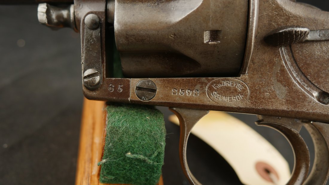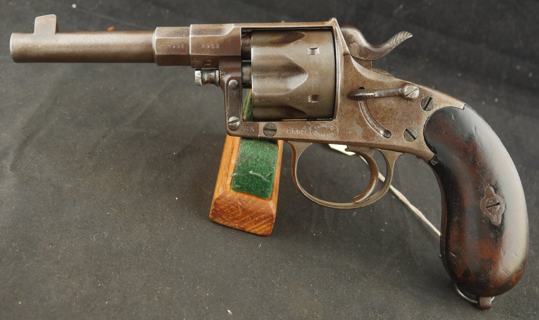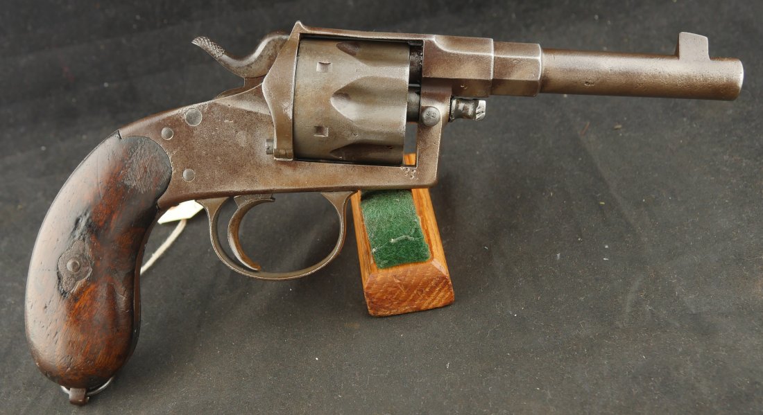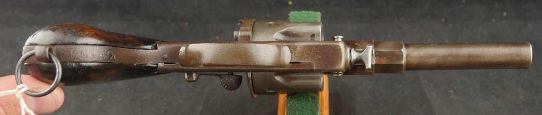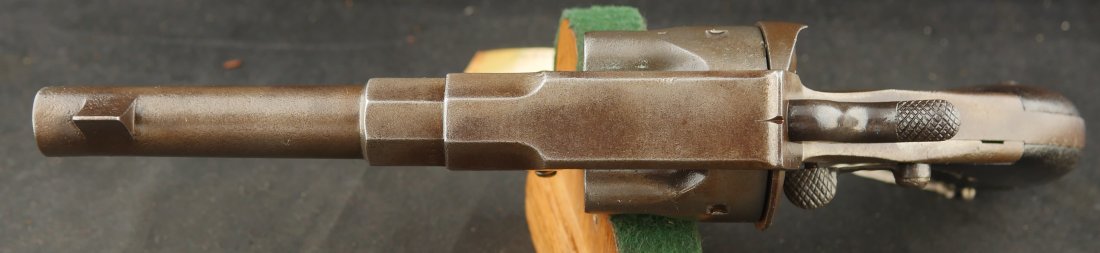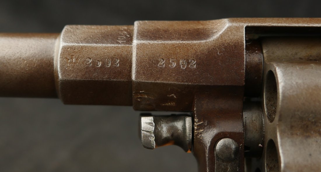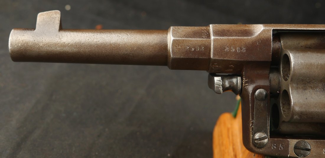GR79-0823-4850, German Reich Military Revolver. 4 1/2 inch barrel. Serial #25xx, I see a bunch of numbers all over the gun and they all match. There is a unit mark or rack mark just in front of the the lanyard ring. The frame is mottled brown with scattered very fine pinpricks. Crisp tight mechanics. The bore is bright, shiny and crisply rifled. Fine bore. These are the predecessor to the German Lugar Military Pistol. Very good overall.